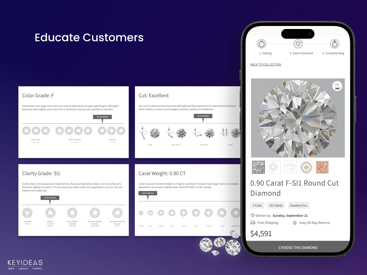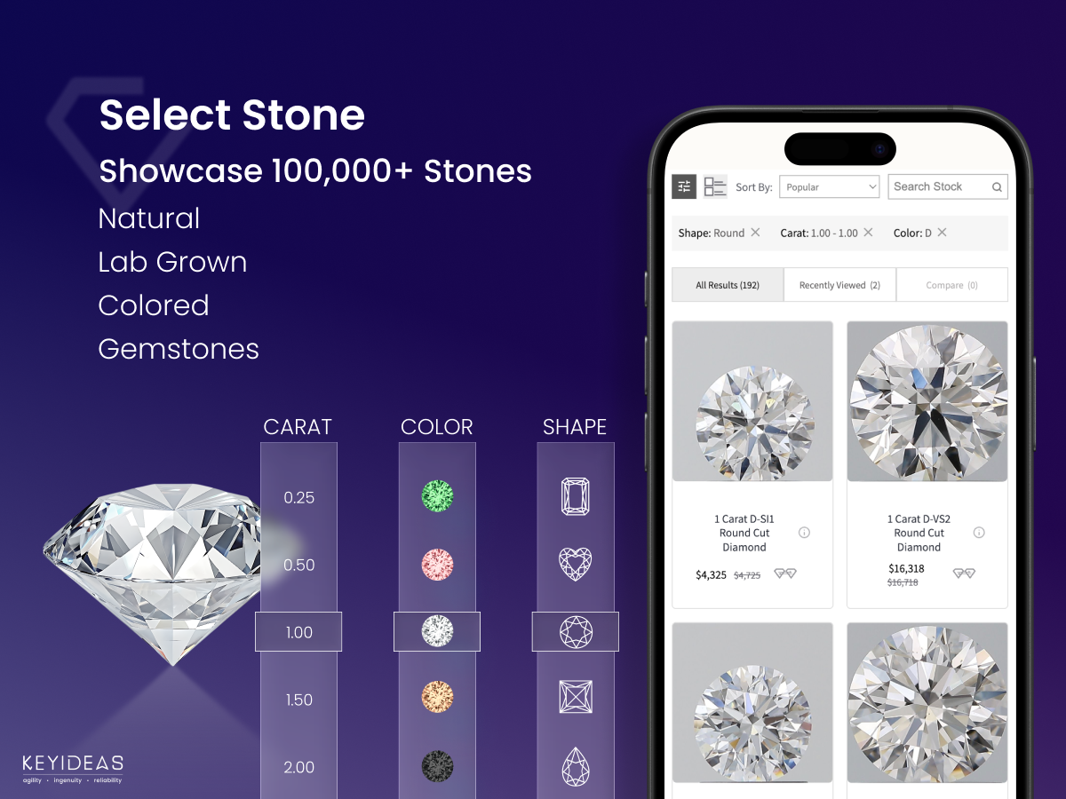 Complete BYOR experience with real-time visualization, dynamic pricing updates, seamless WooCommerce integration with no coding required, mobile-optimized responsive design, diamond size viewer, colorless to colored diamond switcher for easy toggling between diamond types, and support for multiple languages, currencies, and global ring sizes.