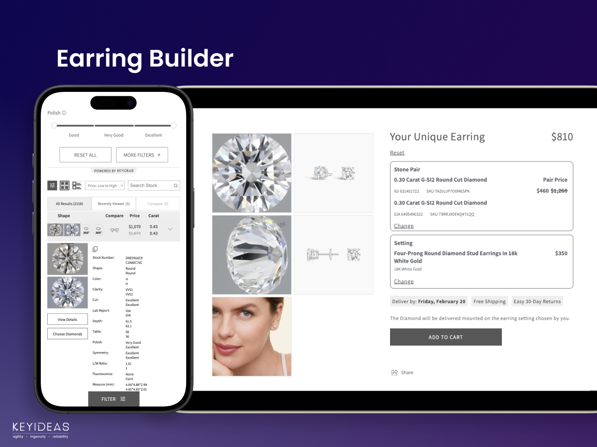 Earring Builder: Allows customers to design custom earrings by selecting a pair of diamonds or gemstones and choosing from various earring settings and styles. Yearly subscription required.