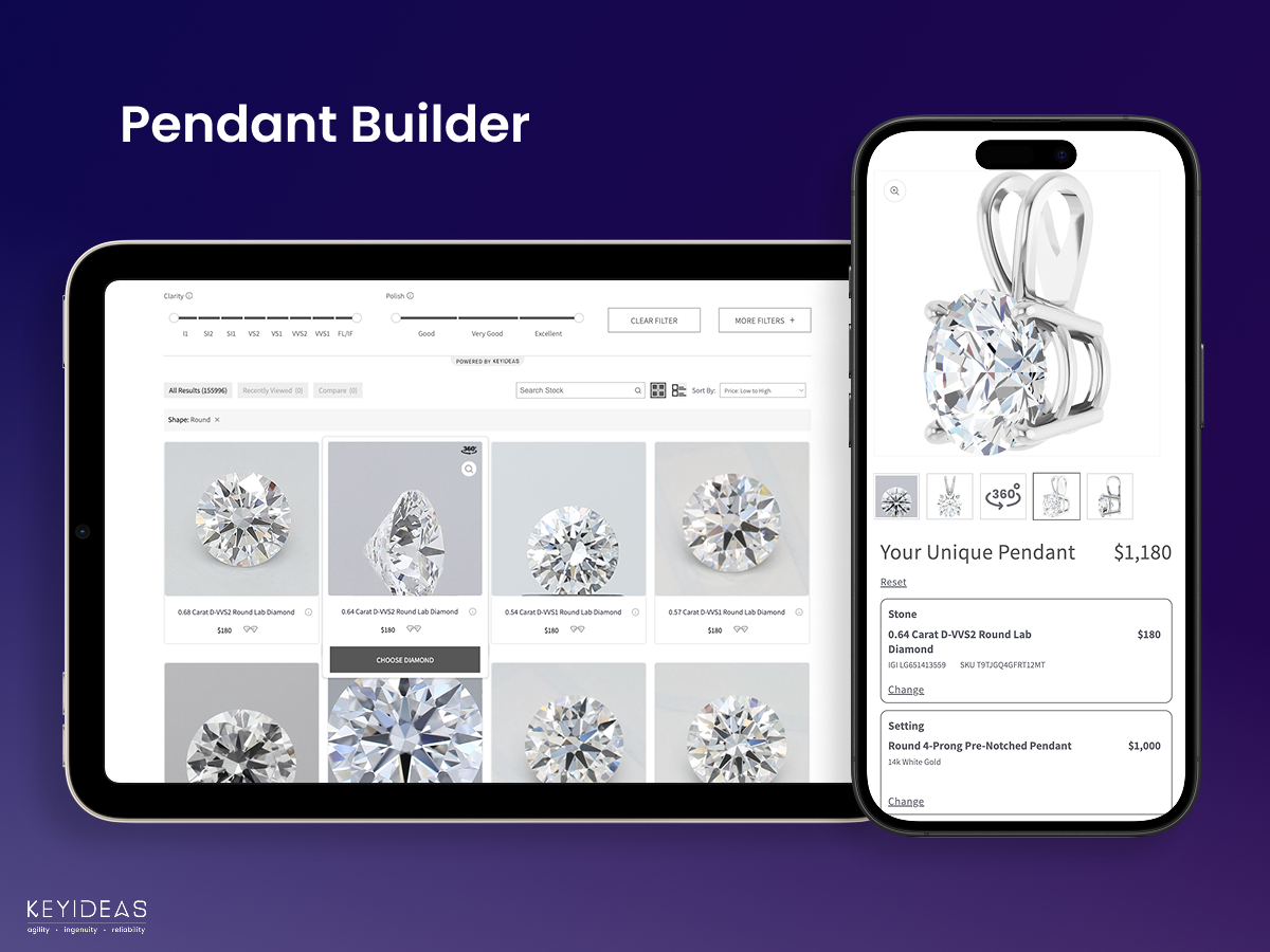 Pendant Builder: Customers can create custom pendants by selecting diamonds or gemstones and pairing them with pendant settings. Works just like the Ring Builder with the same intuitive design process. Yearly subscription required.